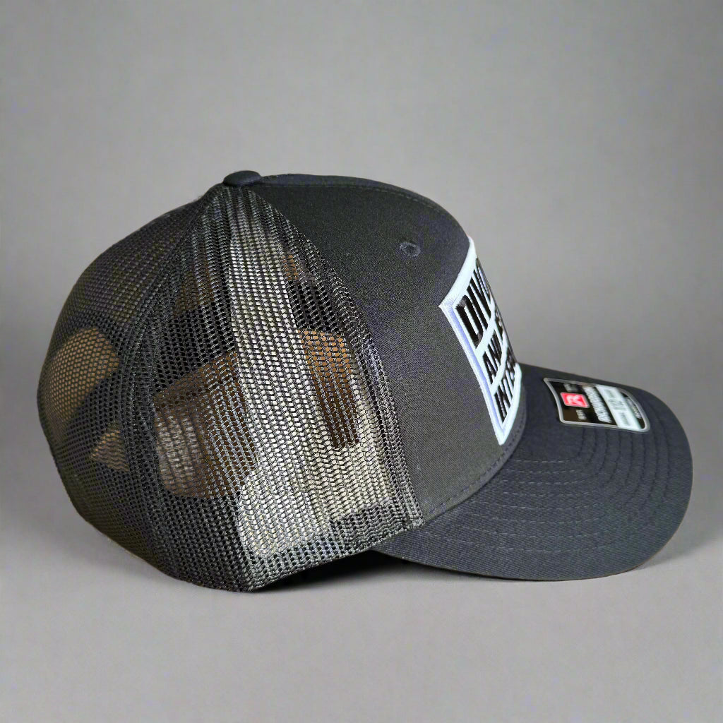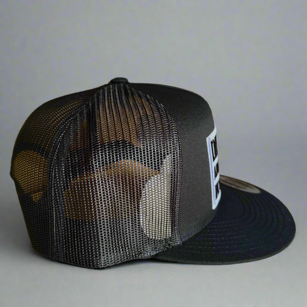 flat bill, mesh back, high profile, adjustable snapback closure