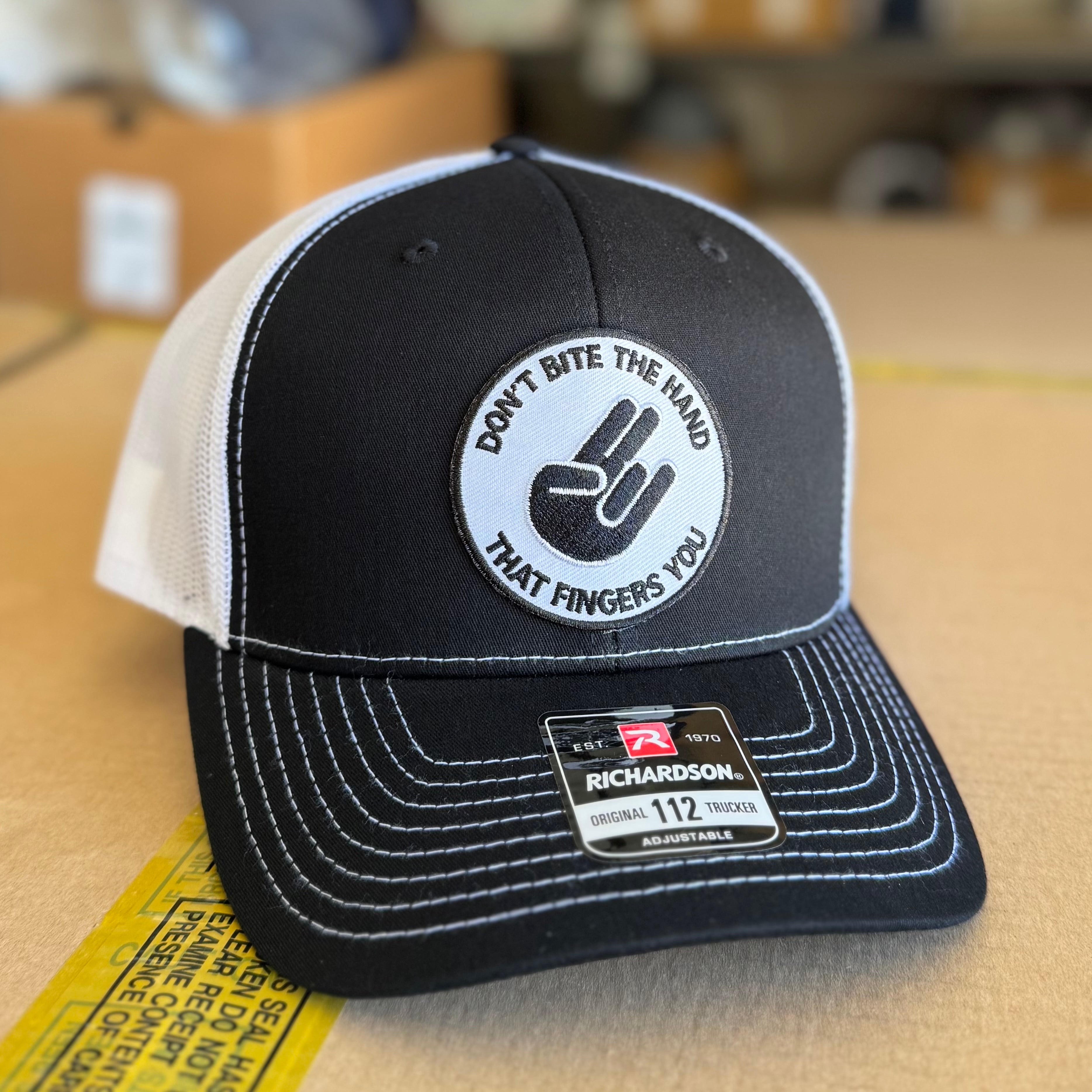 QUICK ORDER Don’t Bite The Hand That Fingers You Hat - Blk/ Wh 112 embroidered circle patch