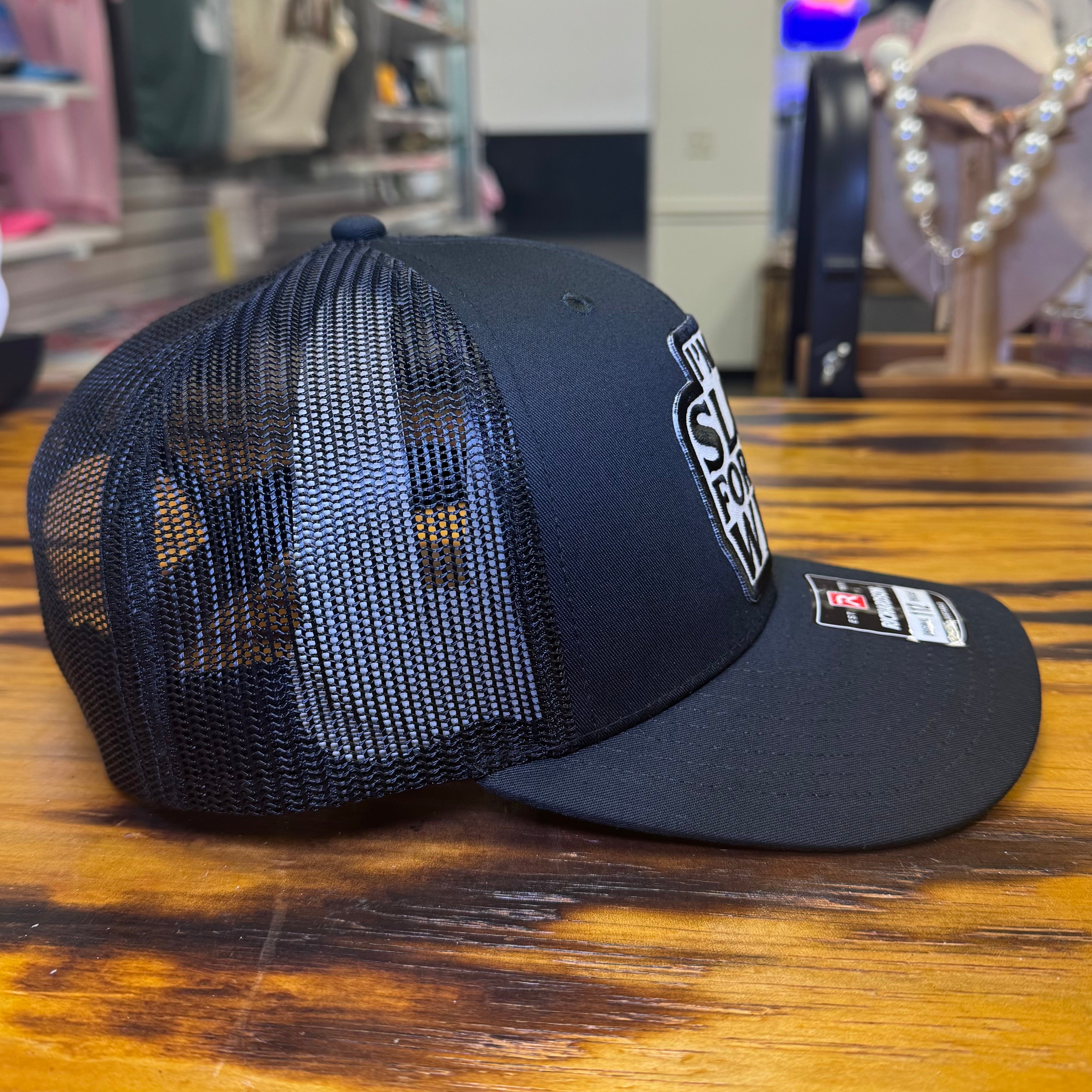 curved bill, mesh back, mid profile, adjustable snapback closure