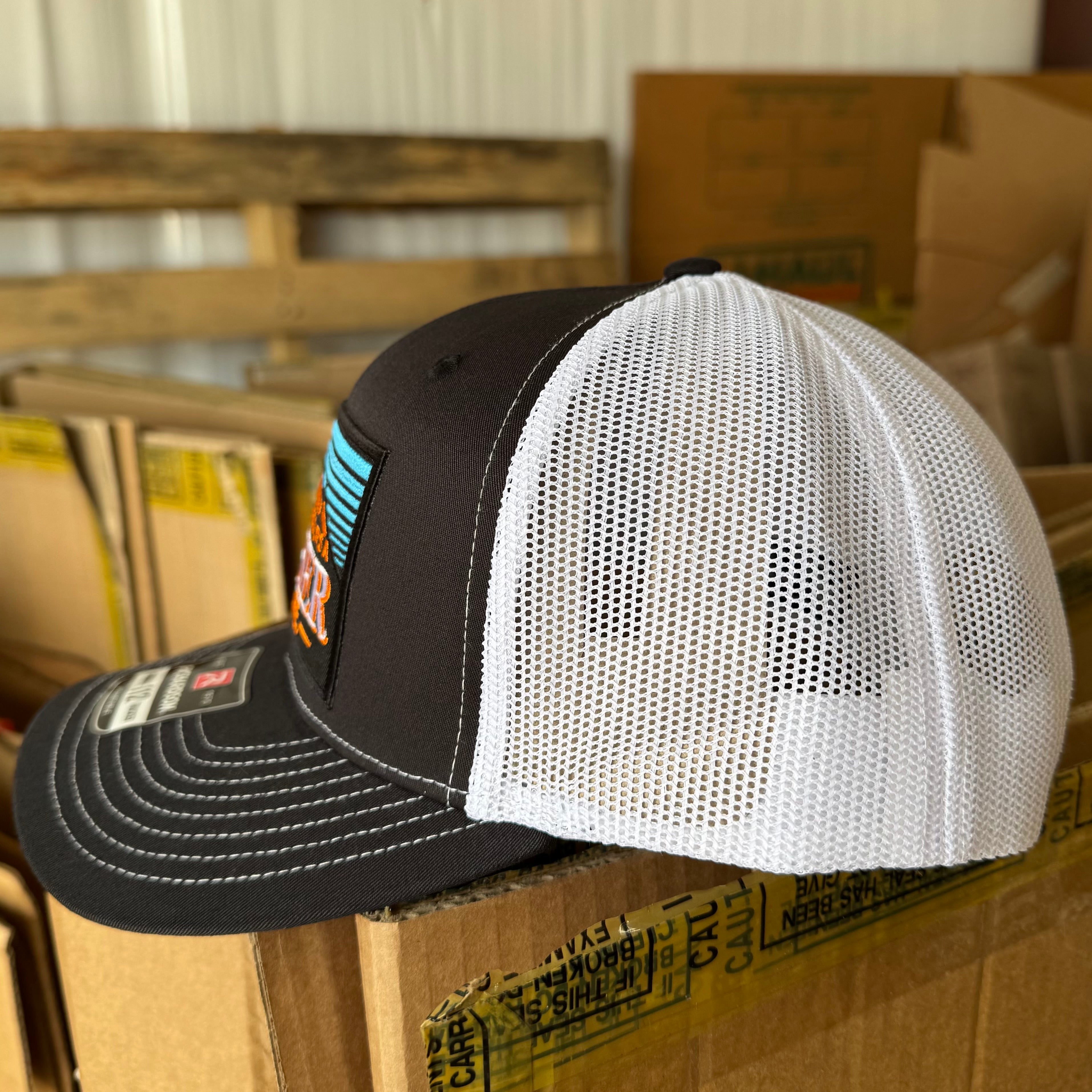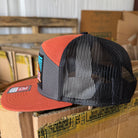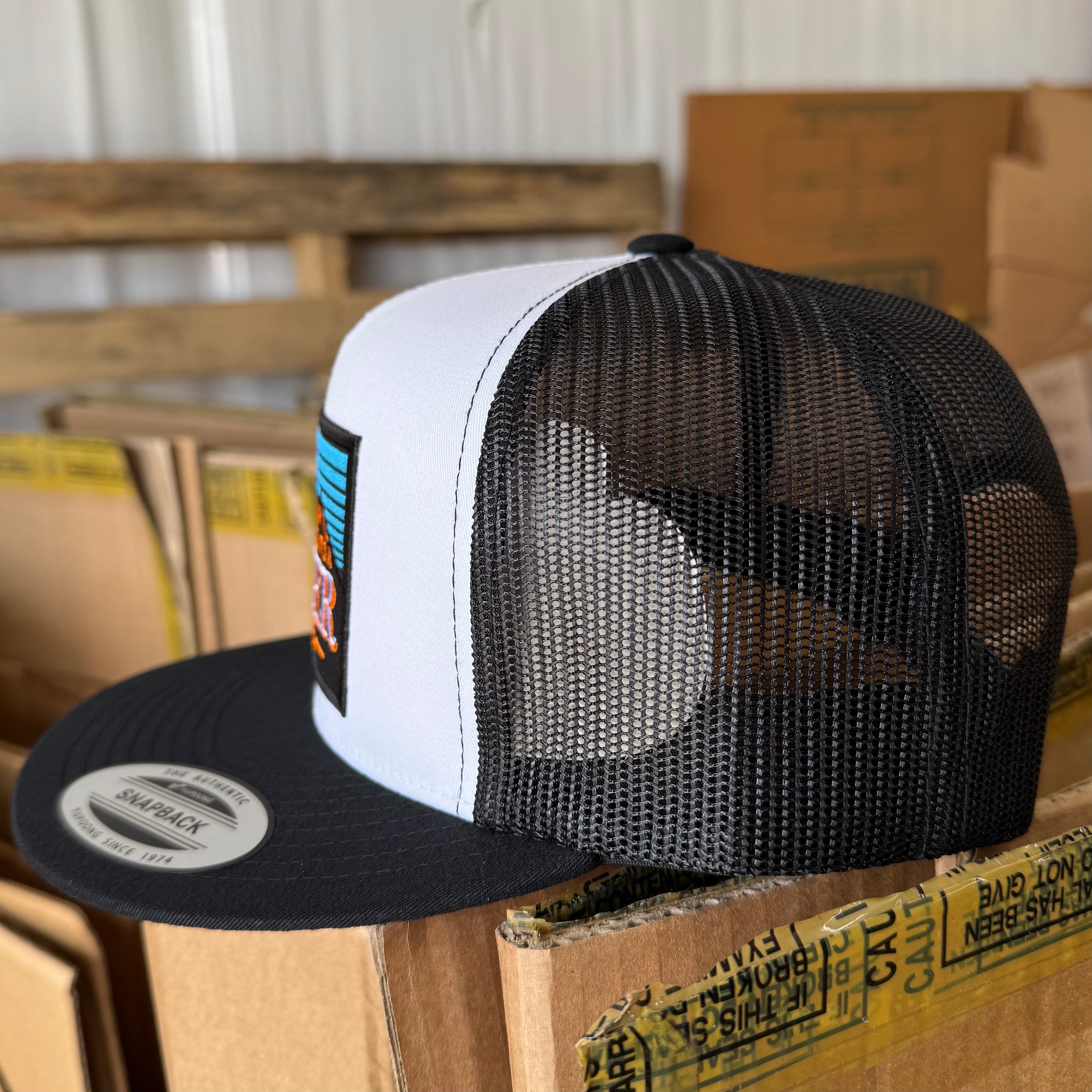 Flat bill, mesh back, high profile, adjustable snapback closure
