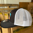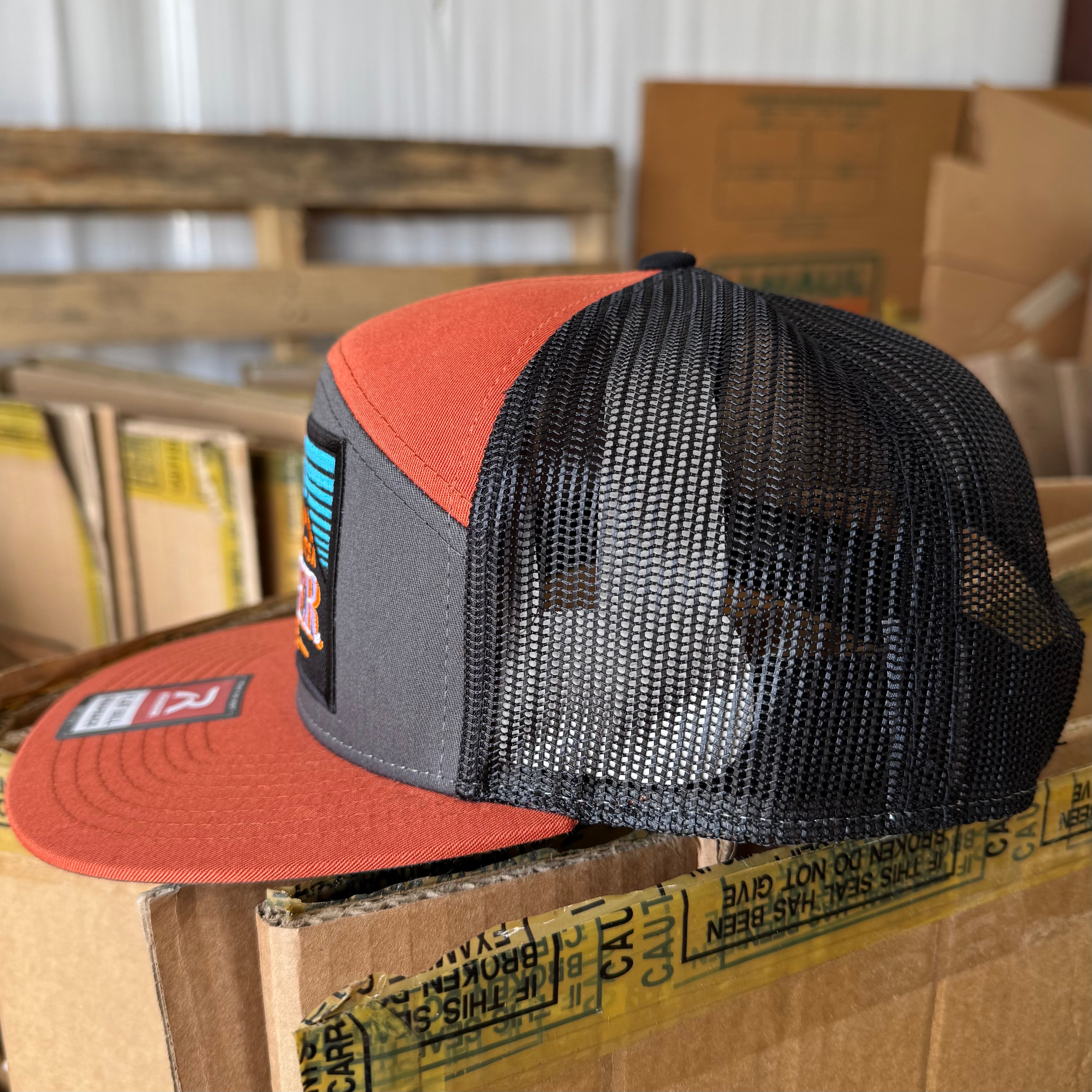 features: flat bill, mesh back, 7 panel, high profile, adjustable snapback closure