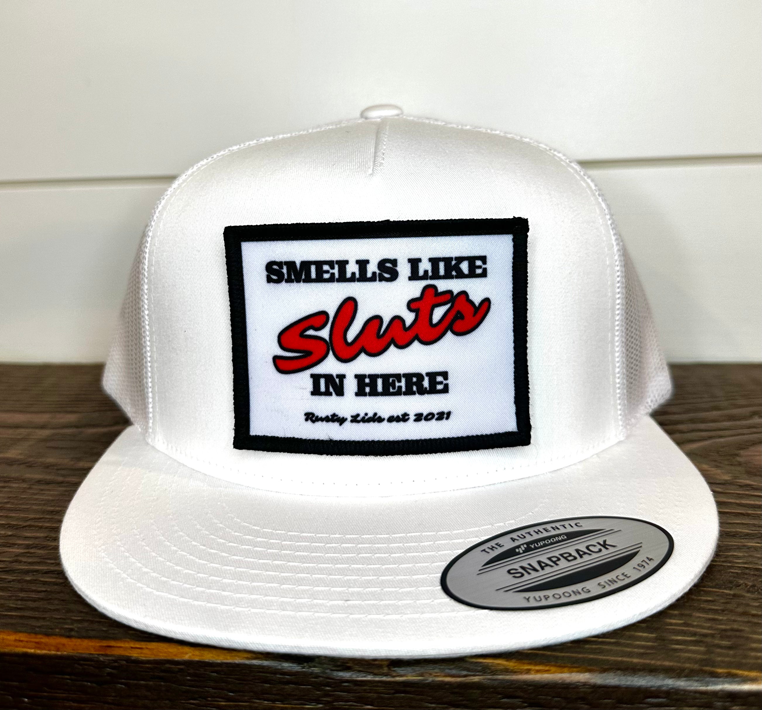QUICK ORDER Smells Like Sluts In Here Hat - White hat-red patch