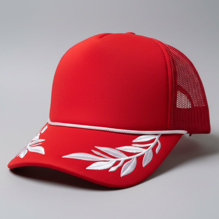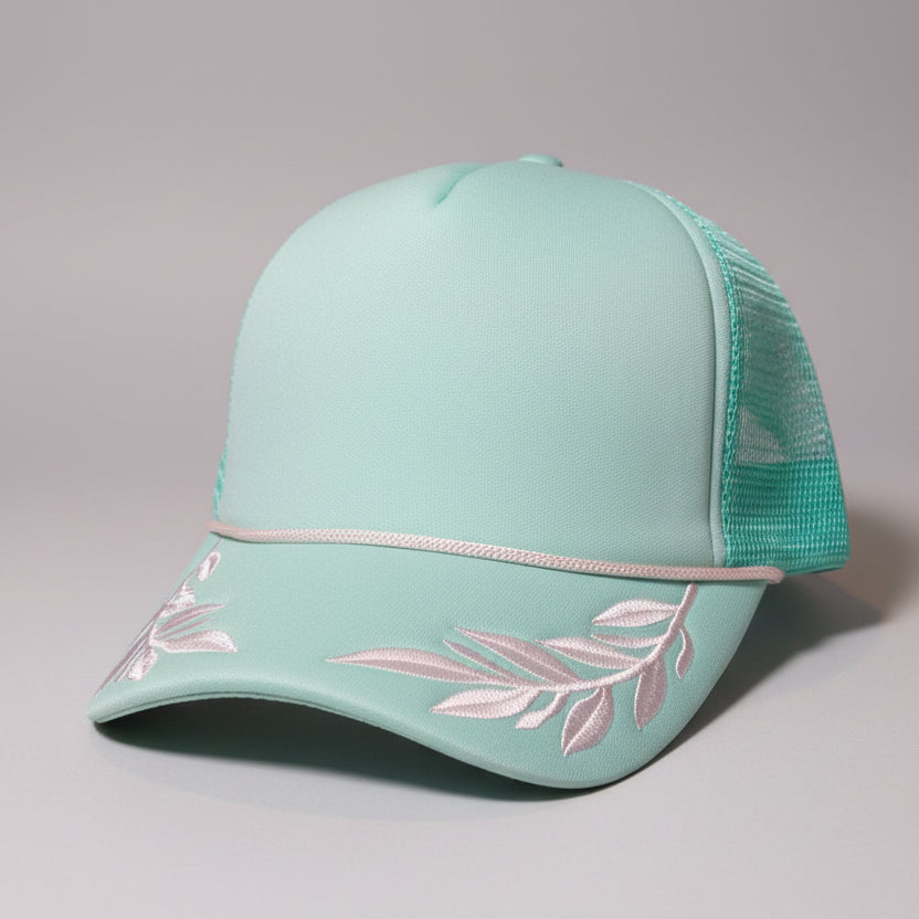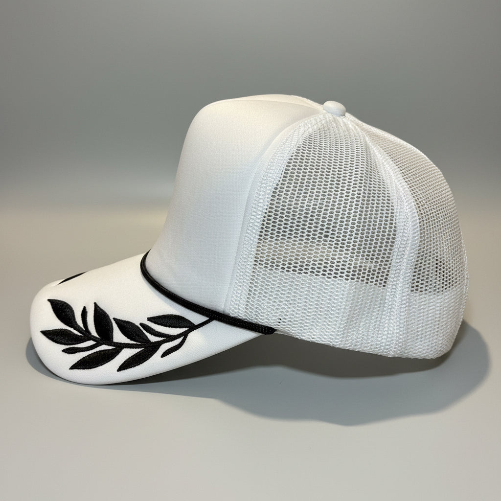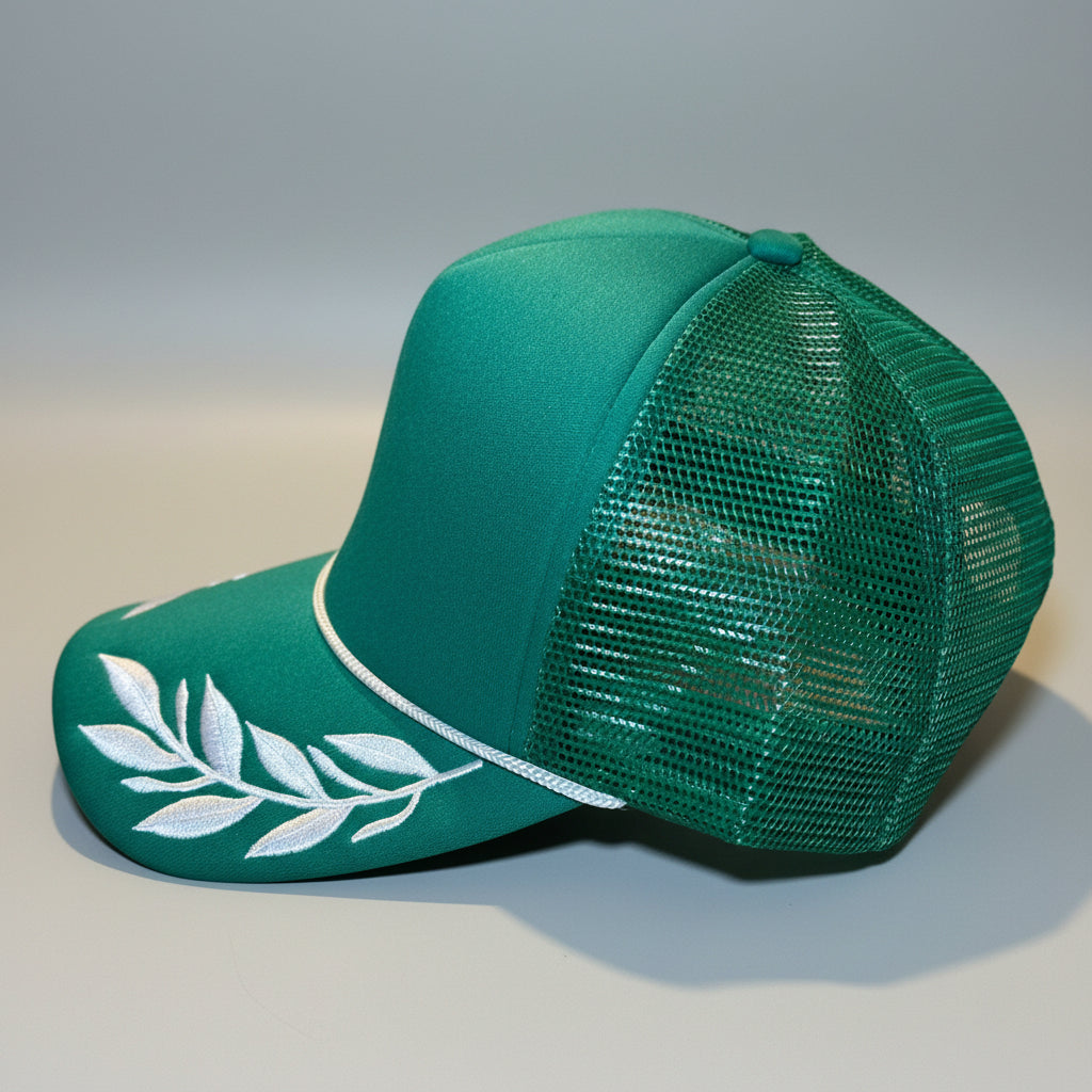 Curved bill, foam front, mesh back, high profile, rope, embroidered leafs on the bill, adjustable snapback closure