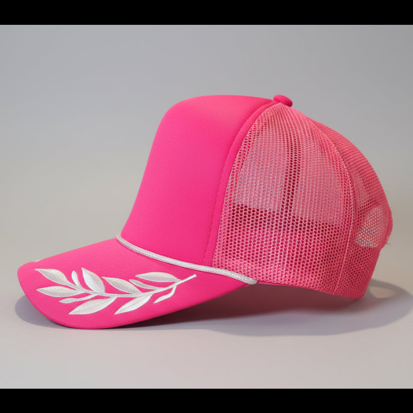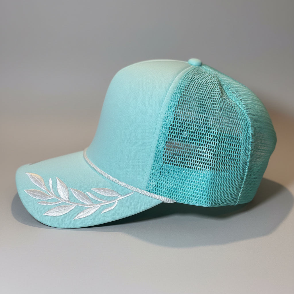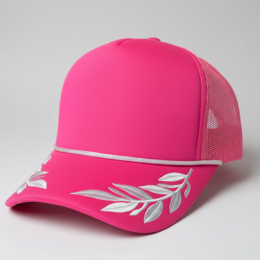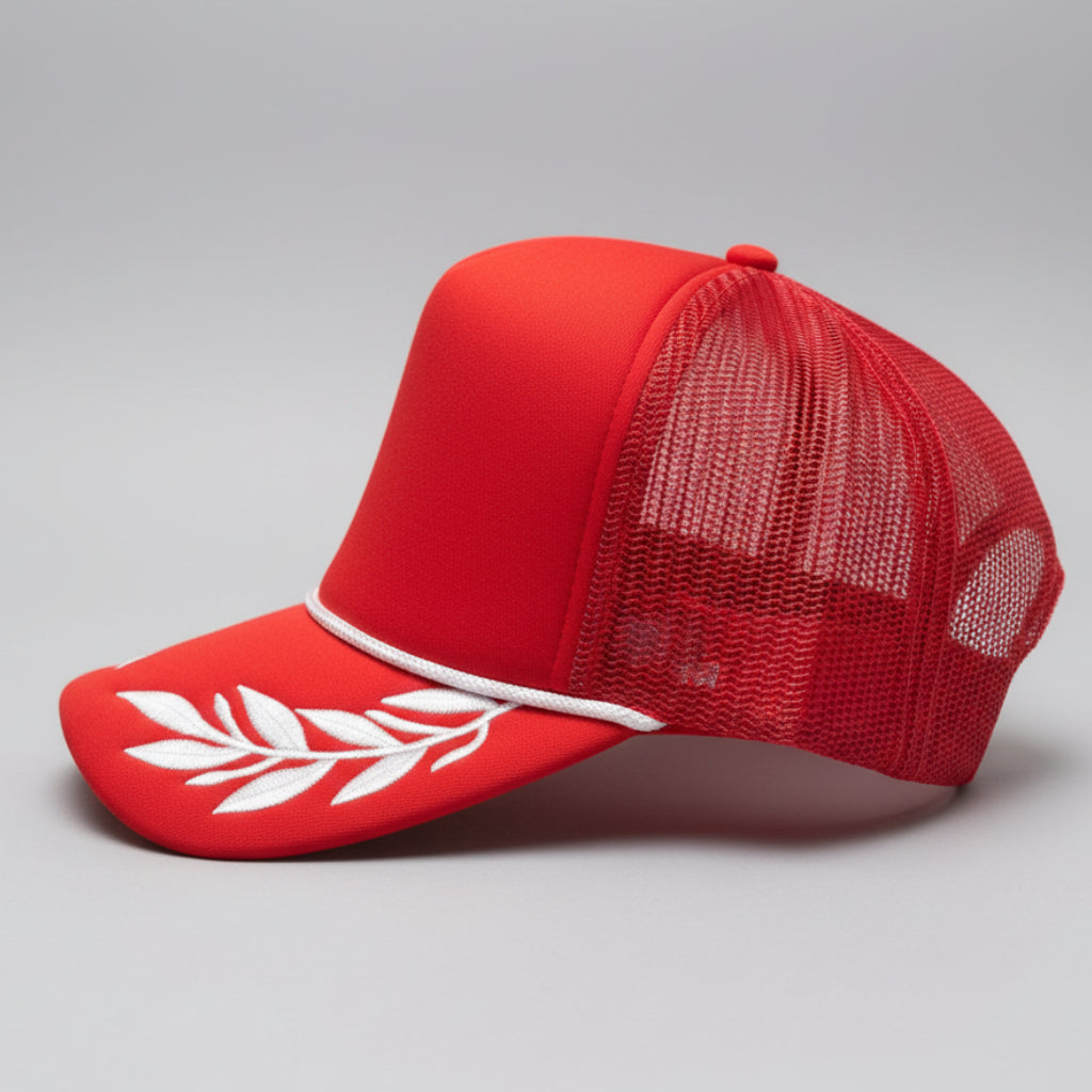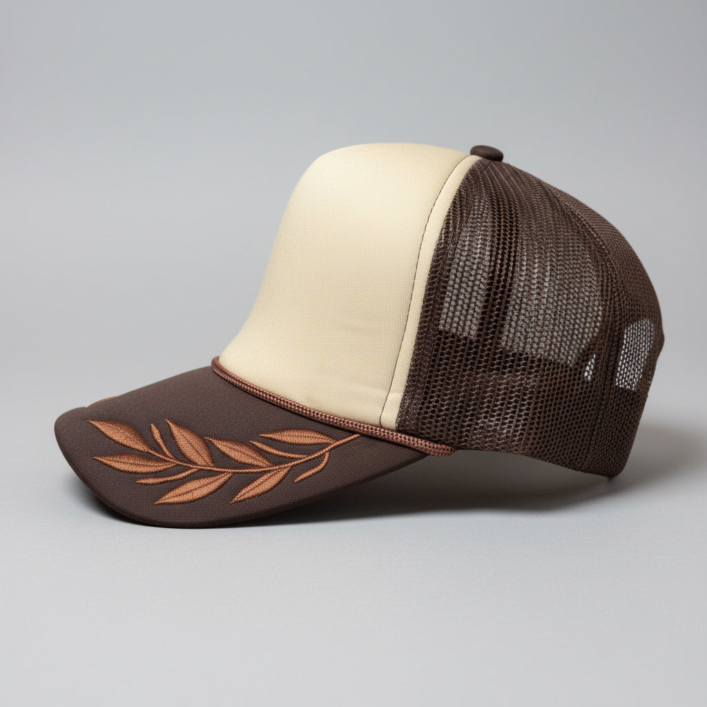 Curved bill, foam front, mesh back, high profile, rope, embroidered leafs on the bill, adjustable snapback closure
