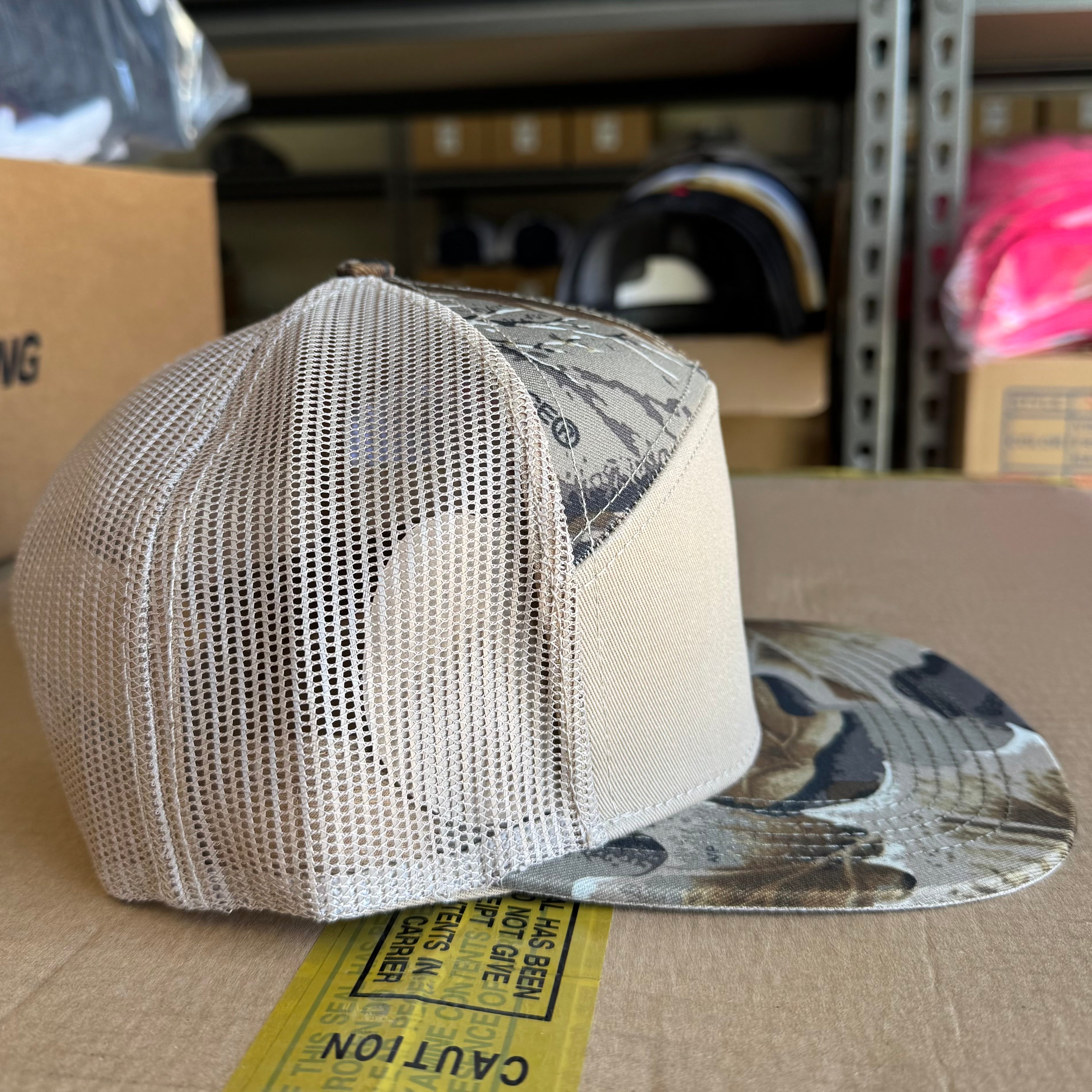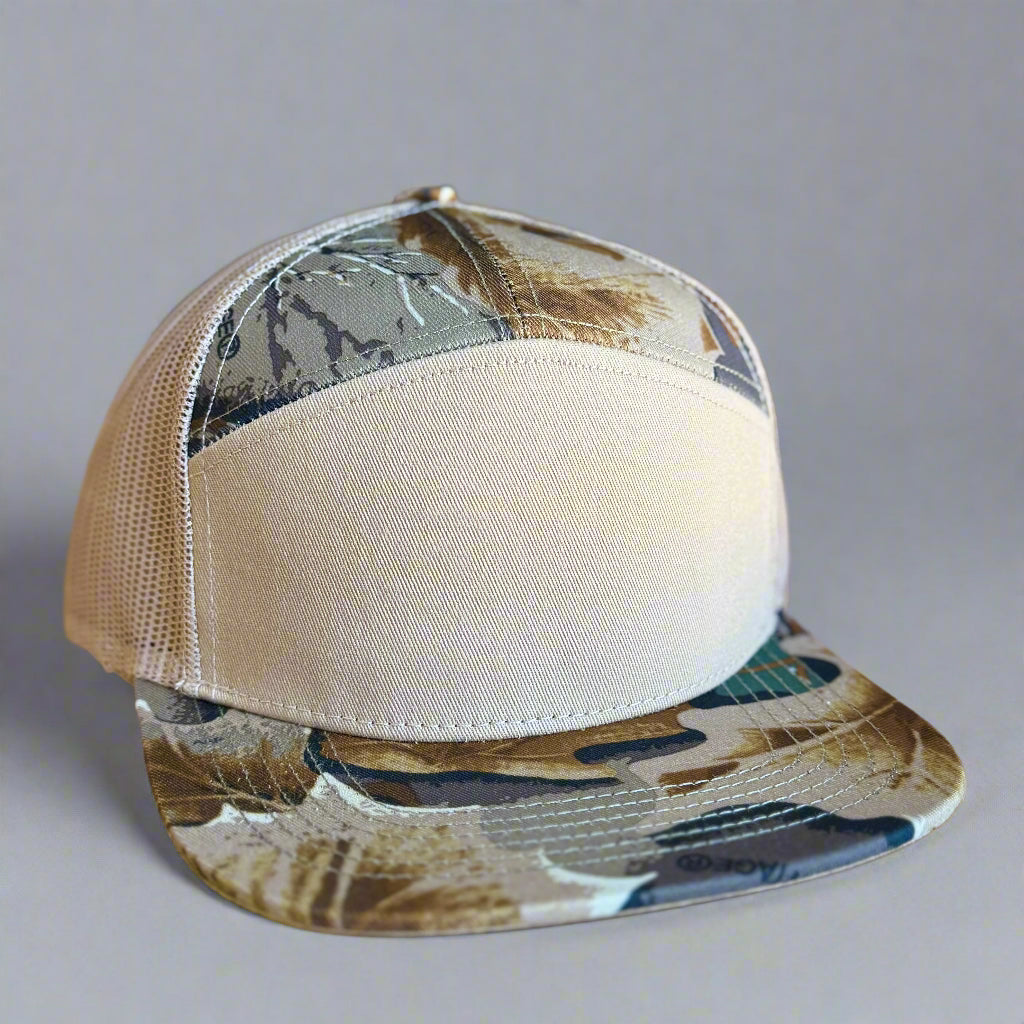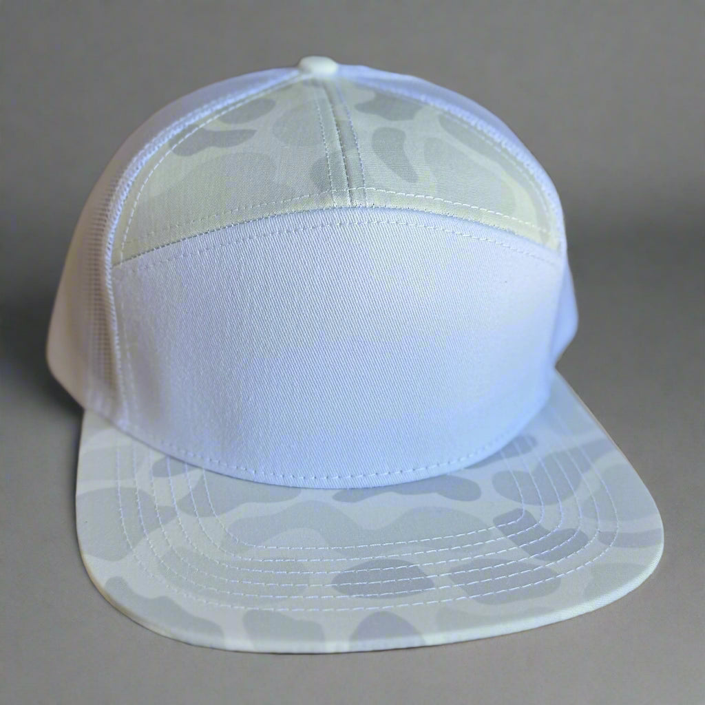 Flat Bill, 7 panel, mesh back, high profile, adjustable SnapBack closure