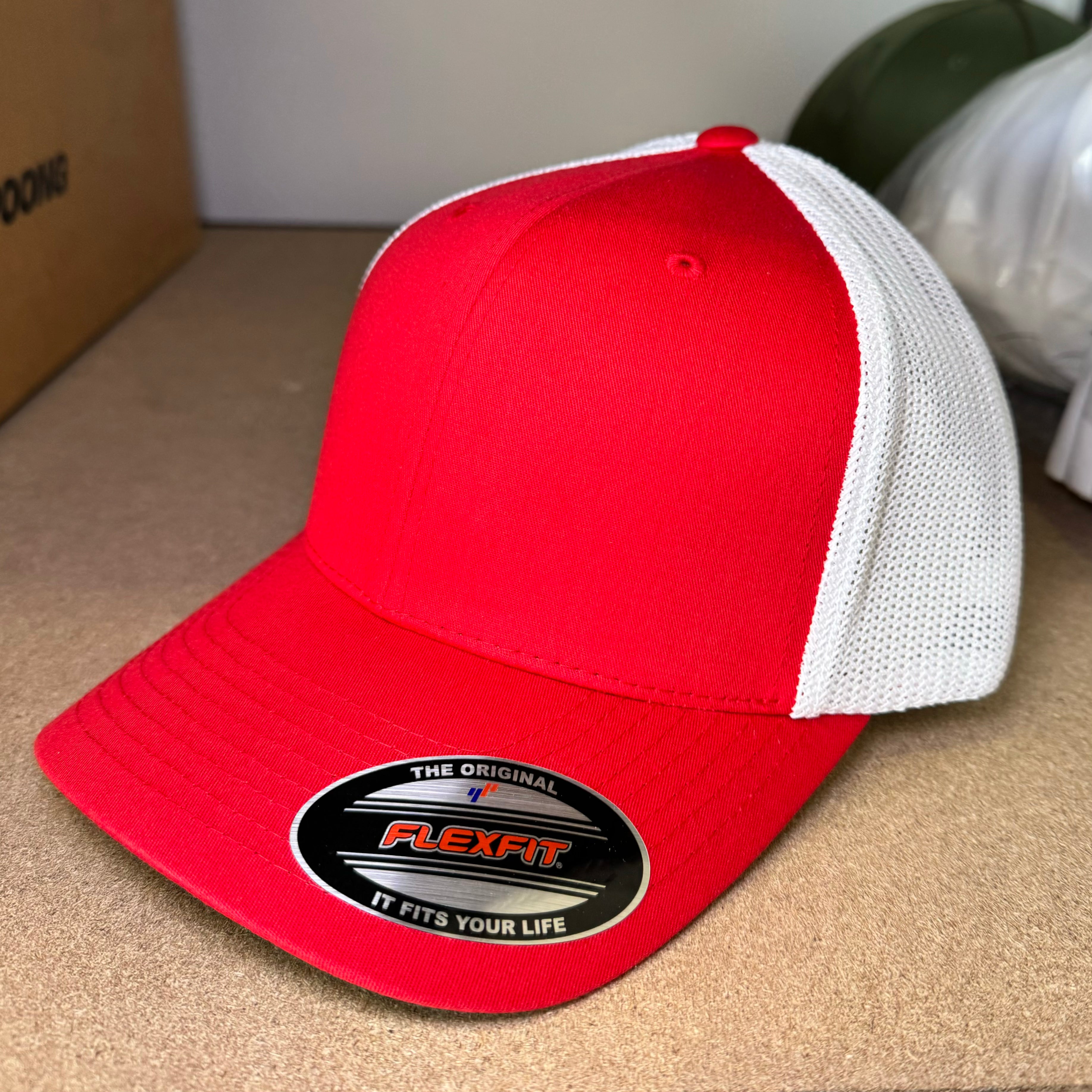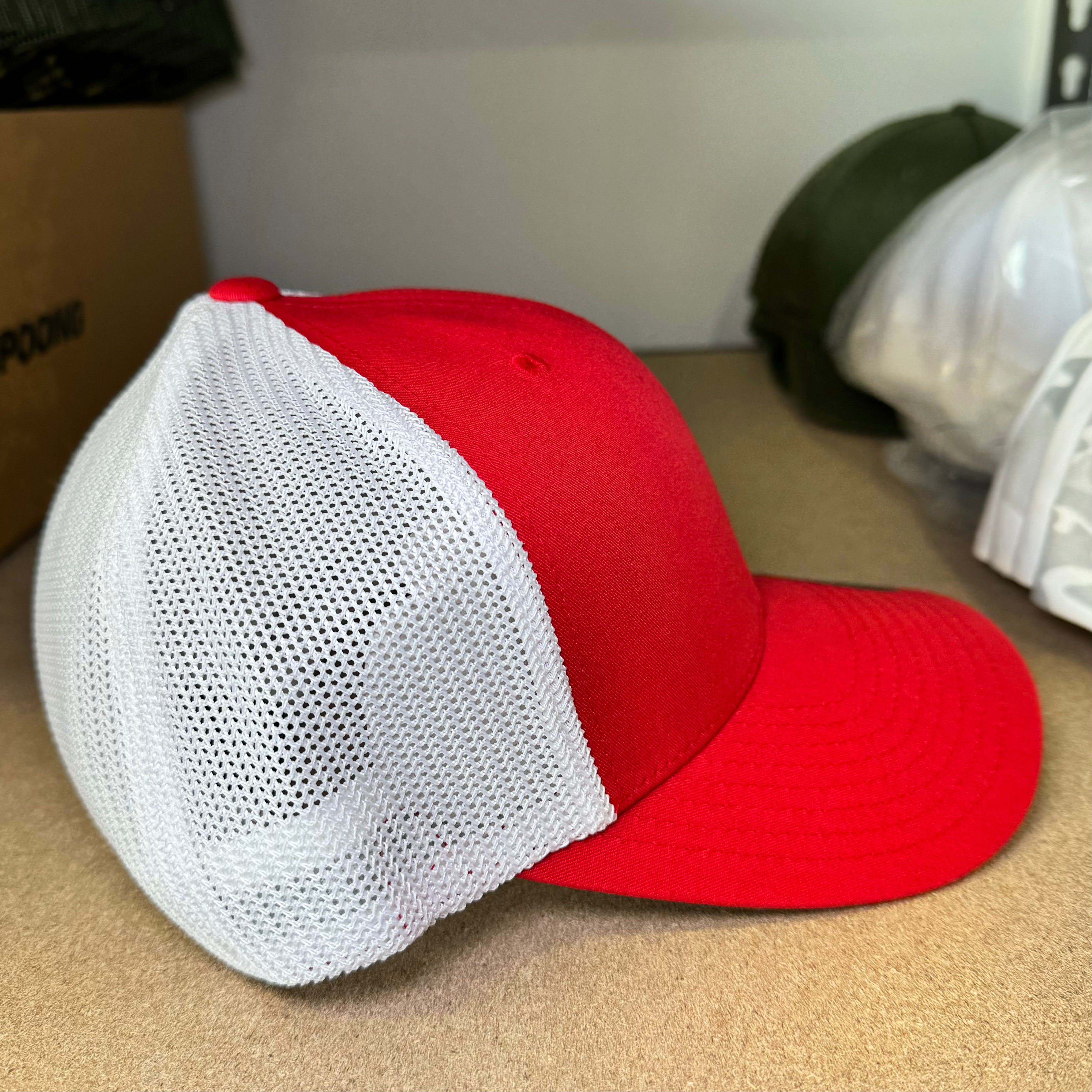 Curved bill, mesh back, stretch fit sweat band, mid profile
