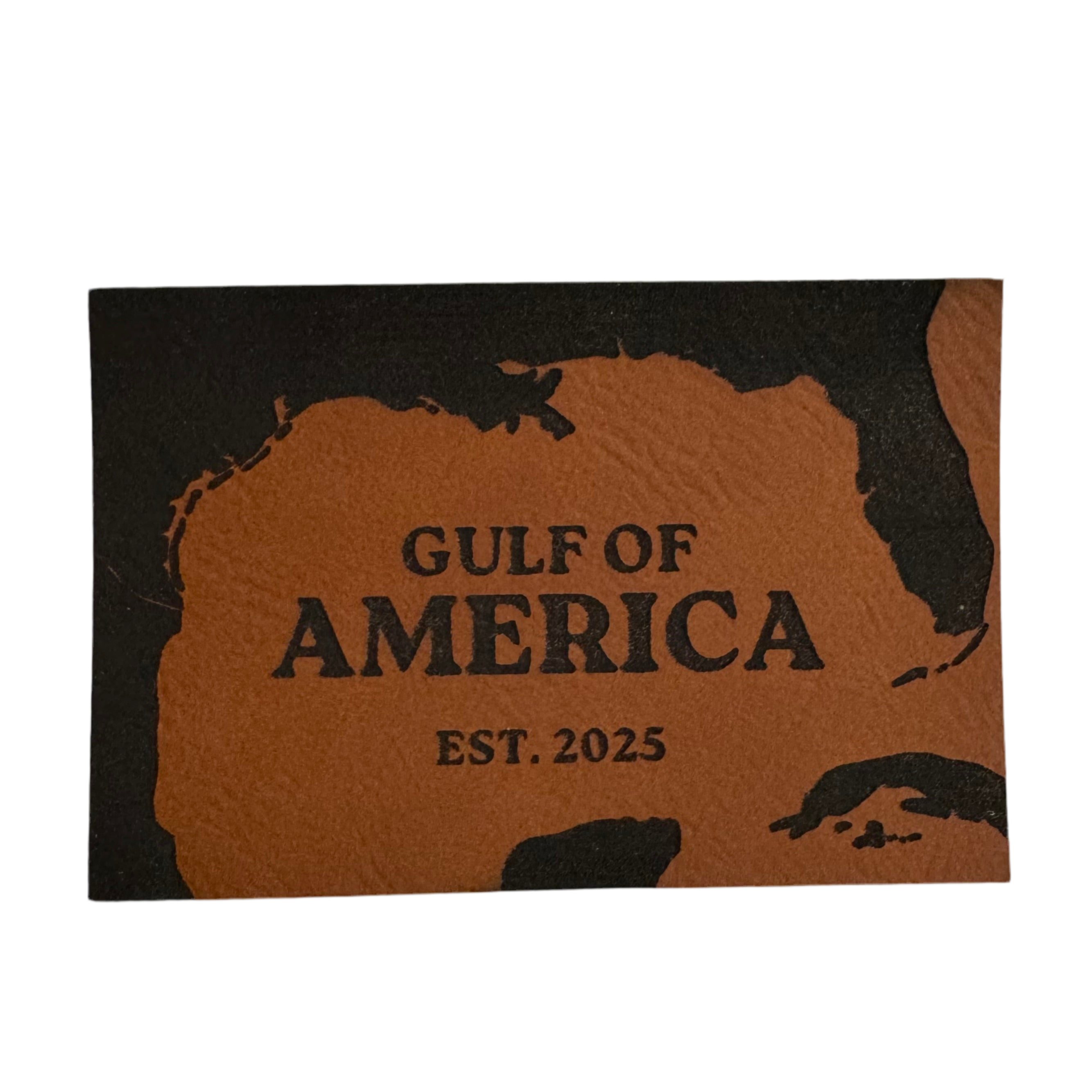 Brown leather. Laser engraved design. Heat activated adhesive backing.