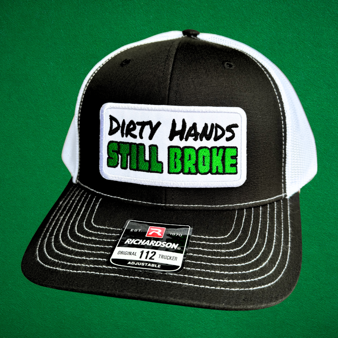 QUICK ORDER Dirty Hands Still Broke Hat - Green Patch| Blk/ Wh 112