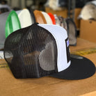 adjustable snapback closure, mesh back, flat bill, high profile.